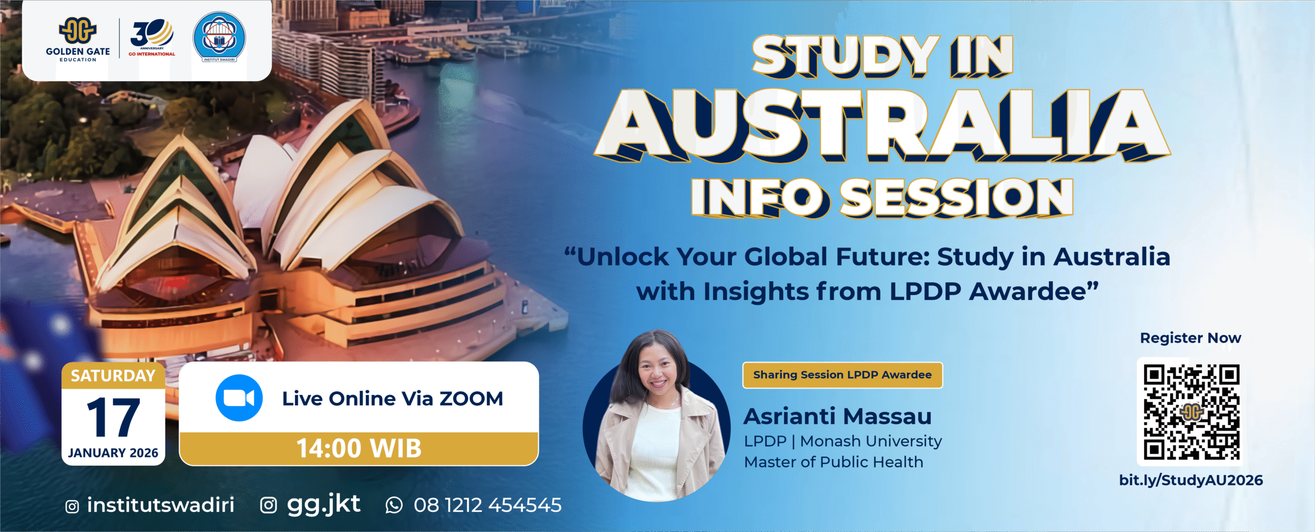 Date Jan 17 2026 Expired! Study in Australia Info Session About YouYour Name(Required) First Your Address(Required) City School / University Name(Required)Grade / Year(Required)How Can We Reach You?We would happy to chat with you. How can we get in touch?Your Email Address(Required) Your Phone(Required)Study AbroadStudy DestinationAustraliaBelgiumCanadaChinaFinlandFranceGermanyHongkongIndonesiaIrelandItalyJapanMalaysiaNetherlandsNew ZealandPolandSingaporeSouth KoreaSpainSwedenSwitzerlandTaiwanThailandUnited KingdomUnited State Of AmericaOthersMajorArchitectureBuilt Environment and PlanningCity ManagementConstruction ManagementDrafting TechnologyEnvironmental DesignInterior DesignLandscape ArchitectureSustainabillityUrban PlanningAnimation and Media ArtsBranded Fashion DesignCinematography, Film and Video ProductionComputer Assited Drafting and AutoCadDanceDigital ArtsDrama and Theater ArtsFashion and Apparel DesignFine ArtsFloral DesignPlanning Year202520262027202820292030Agreement(Required) By checking this box, you agree to be contacted by Golden Gate Education s via email/text message/phone + Add to Google Calendar